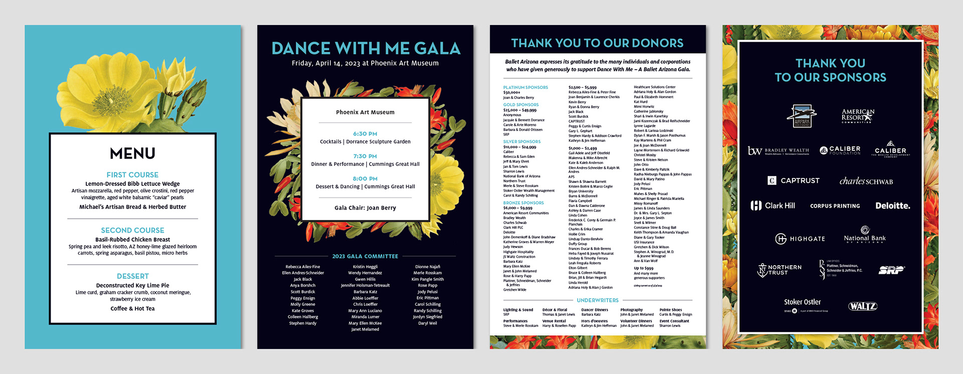 Client: Ballet Arizona Materials: Invite Package, Sponsorship Forms, Direct Mail Save the Date, Event Signage and Program. Creating an invitation package for a special event provides opportunities to break away from the traditional look of an organization’s marketing materials. These exciting opportunities can push both visual and format creative boundaries within an organization. Ballet Arizona's Annual Gala invitation and the supporting materials that followed its design language are a great example of event branding across multiple formats. The Ballet's 2023 Gala celebrated a new ballet – The Rite of Spring – created for a special performance at Phoenix's Desert Botanical Garden, and set to Stravinsky’s score of the same name. Inspired by this new ballet that celebrates the earths return of spring and the great surge of creative power that comes with it, the graphics evoke an explosion of botanical life and dance.