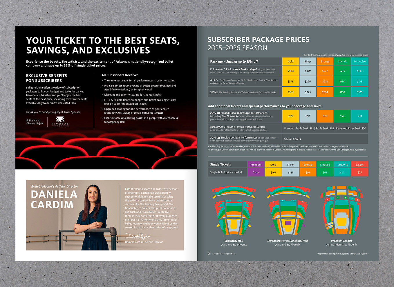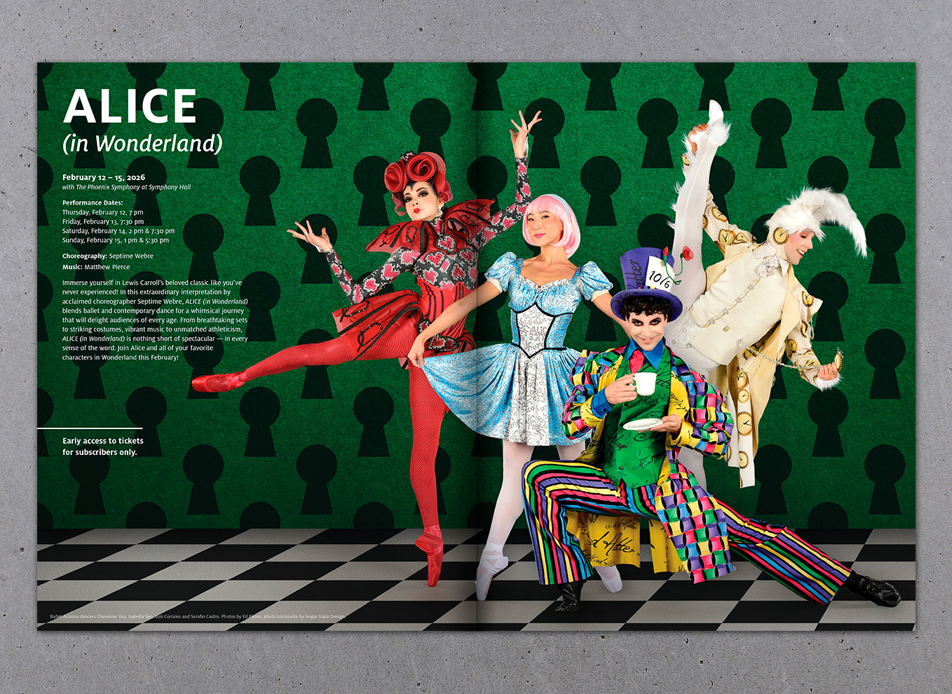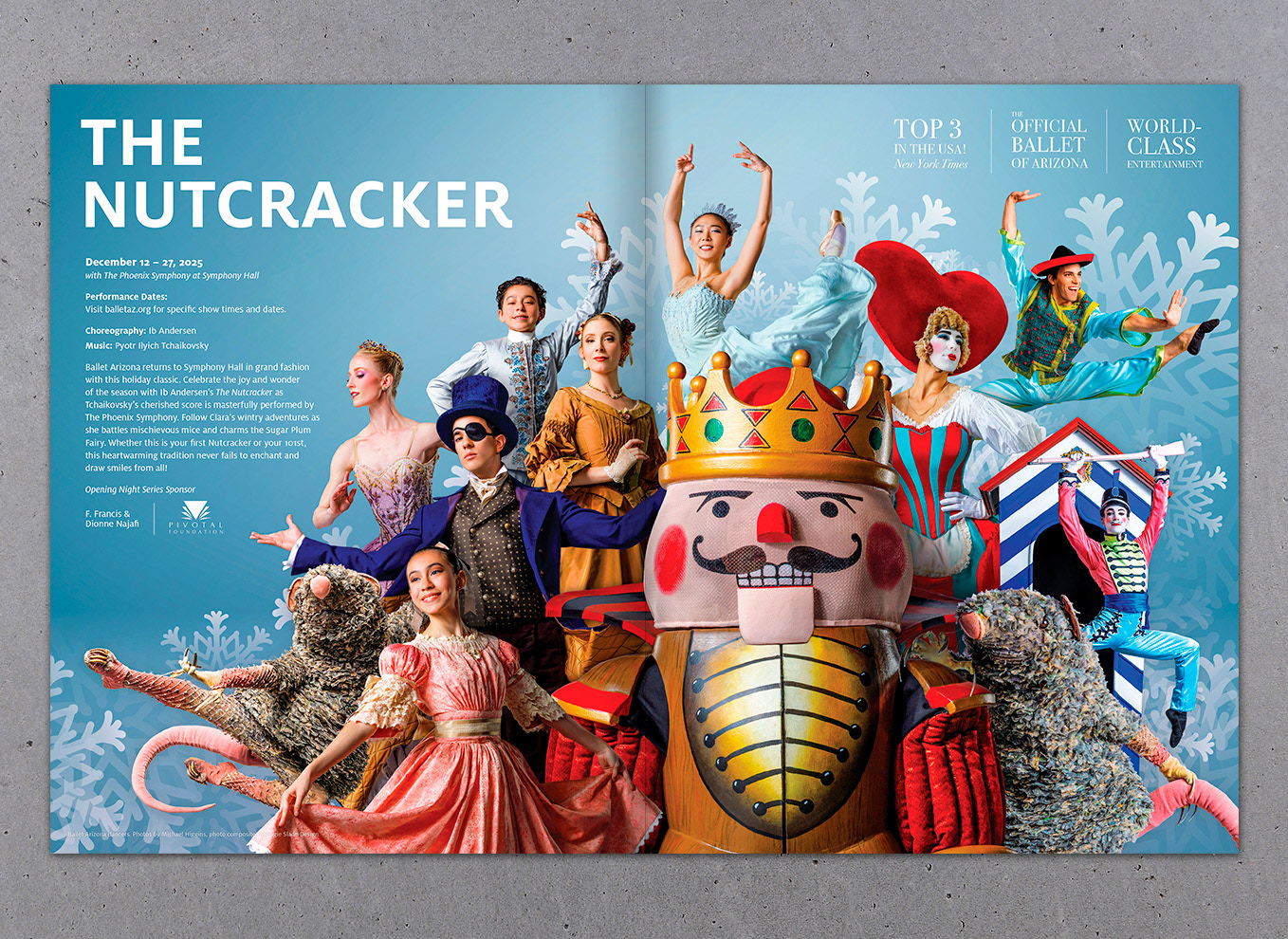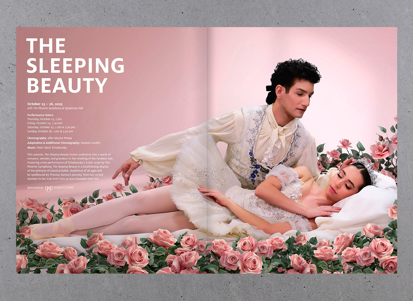 Client: Ballet Arizona Materials: 16 Page Season Brochure Brochure created for Ballet Arizona's 2025-2026 season of performances. Featuring photo composite images created from art directed photo shoot images and stock photography.