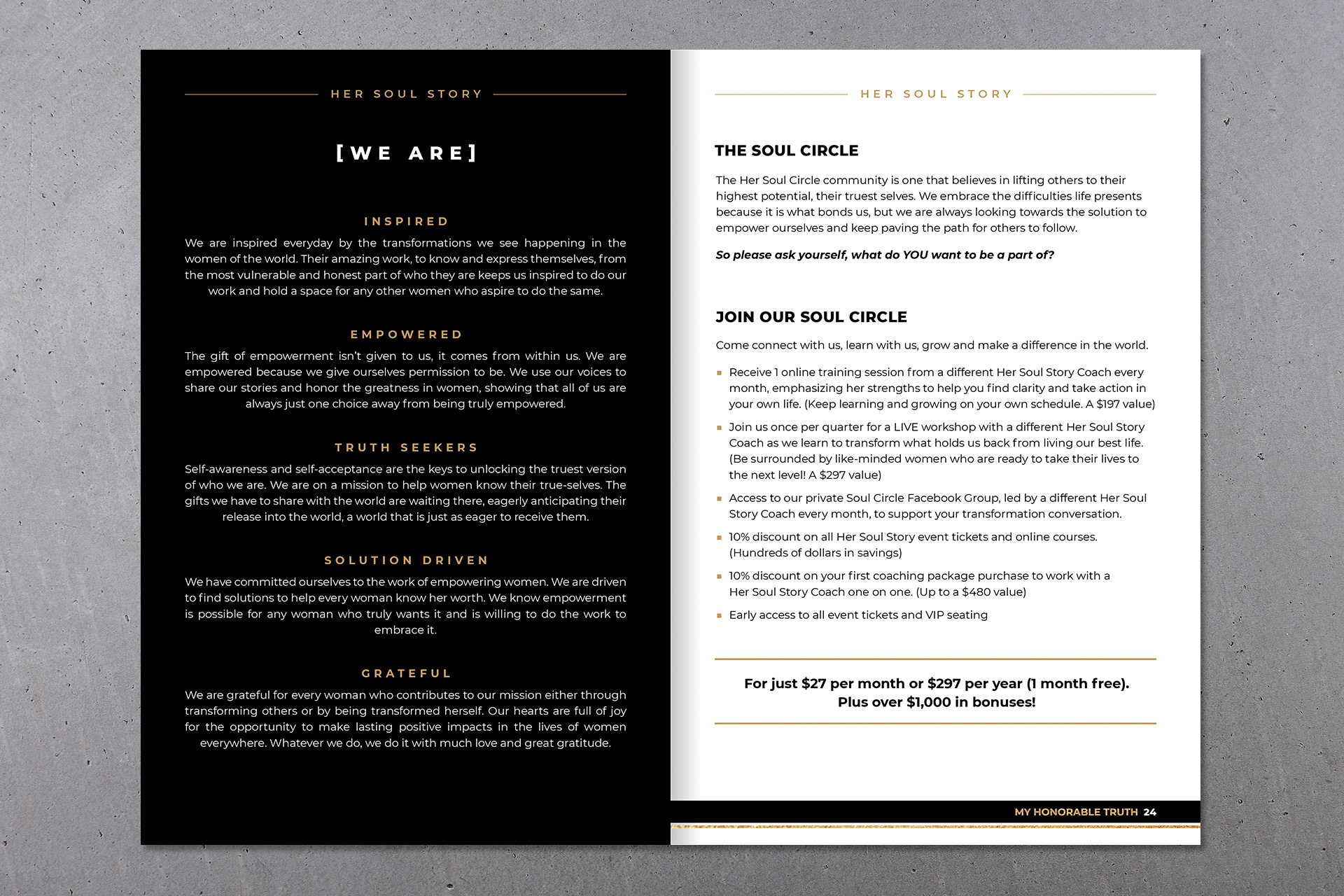 Client: Her Soul Story Materials: Logo, Flyer and Program Created by Her Soul Story, the My Honorable Truth event was designed to bring messages from women, to women, on the joy, worthy struggle and honor of embracing this life's journey. The marketing and event materials developed for this empowering event utilized black and white imagery with touch of golden glitter to communicate unity and honor.